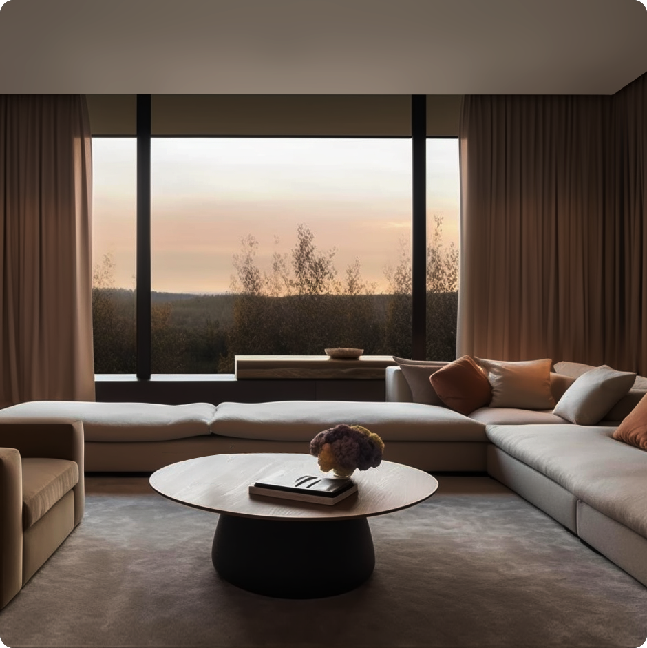 - Nhà ở cao cấp: Phòng khách trần cao, phòng ngủ rèm 2 lớp, khung cửa kính lớn.